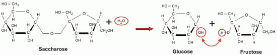 C12H22O11(saccharose)+H2O(eau)----->C6H12O6(glucose)+C6H12O6(fructose)